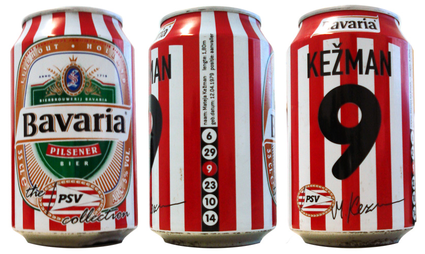 A lata que homenageia o atacante Kezman traz em sua frente a logo da cerveja, com o escudo do PSV, ambos acima das listras verticais vermelhas e brancas da camisa do clube.