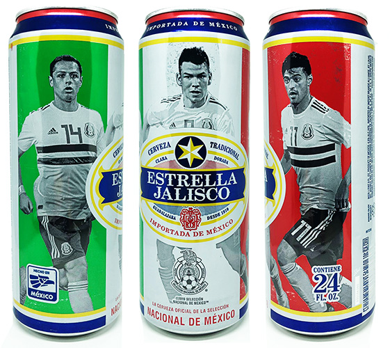 Chicharito, Lozano e Carlos Vela são os destaques do incrível latão de 710ml da Estrella Jalisco para a Seleção Mexicana de 2018.