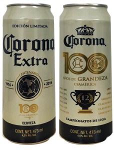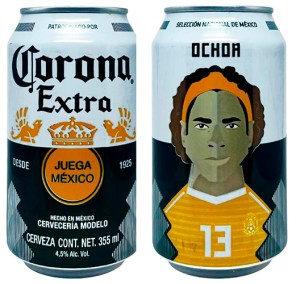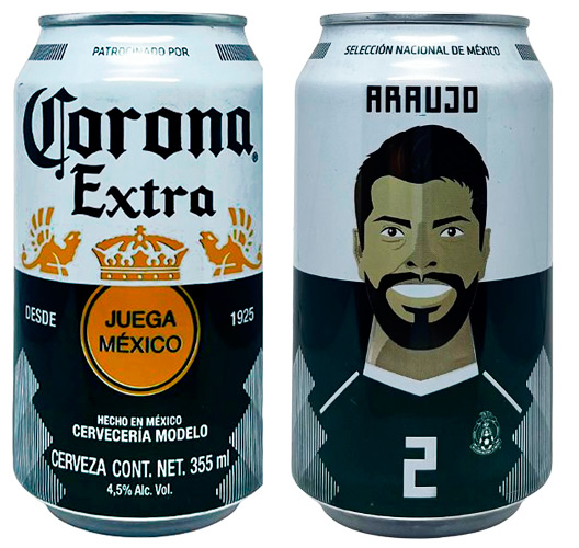 Linda lata da Corona Extra, negra, com o escudo da Seleção Mexicana.