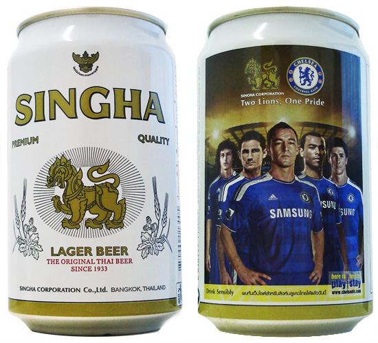 O leões do Chelsea e da Singha se uniram em mais esta lata comemorativa da cervejaria tailandesa.
