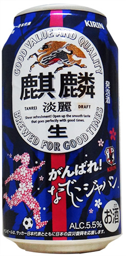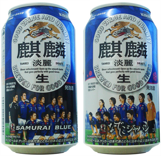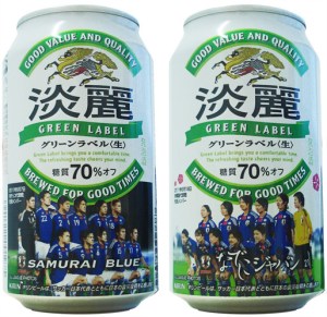 A lata da Kirin Green Label traz na foto da esquerda os Samurai Blue, seleção masculina do Japão.