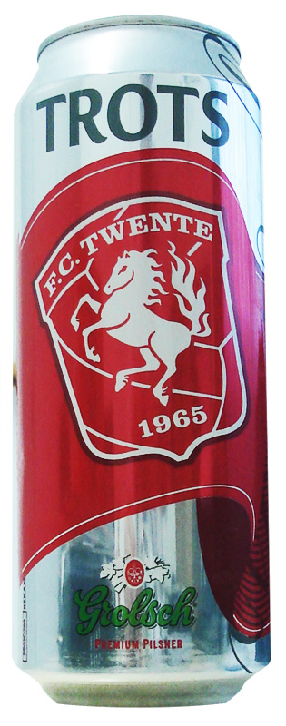 Os torcedores do FC Twente ganharam esta belíssima lata da Grolsch com o escudo do time na bandeira vermelha tremulante.