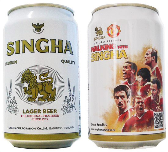 Na esquerda superior da lata aparecem as logomarcas da Singha e do Manchester e o slogan, já traduzido: “Caminhando com Singha”.